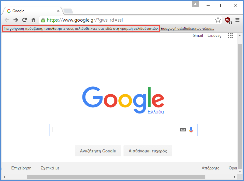 Αρχικά, ανοίγουμε το Google Chrome. Αν η γραμμή σελιδοδεικτών δεν εμφανίζεται, πατάμε ταυτόχρονα "Ctrl + Shift + B" και παρατηρούμε το μήνυμα "Για γρήγορη πρόσβαση, τοποθετήστε τους σελιδοδείκτες σας στη γραμμή σελιδοδεικτών". To "Ctrl" βρίσκεται στο κάτω αριστερό μέρος του πληκτρολογίου και το "Shift" ακριβώς από πάνω του.