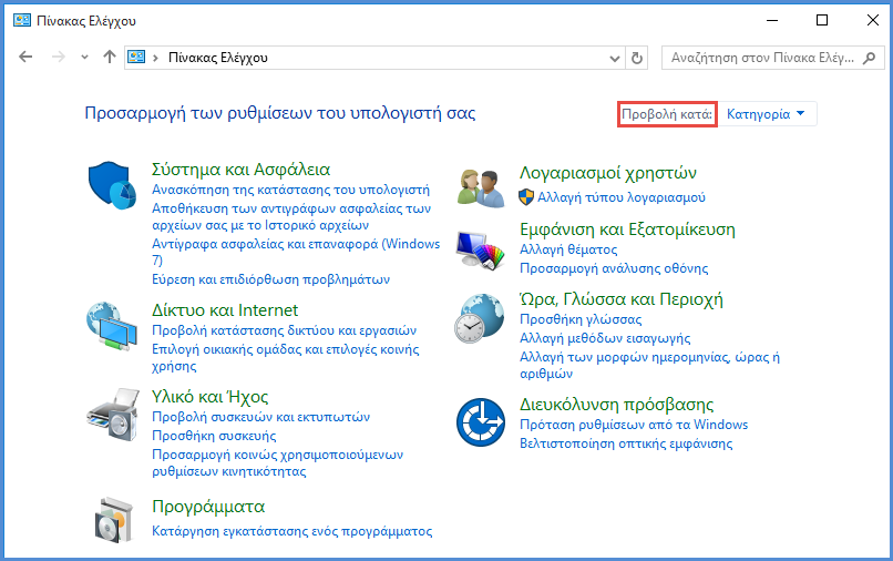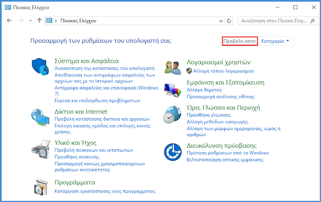 Πηγαίνουμε στον "Πίνακα Ελέγχου" και στο πεδίο "Προβολή κατά" επιλέγουμε "Μικρά εικονίδια".