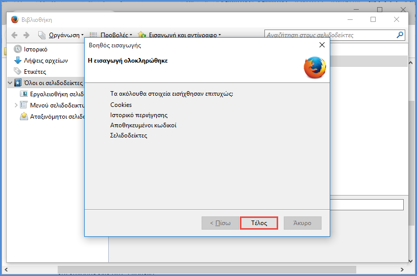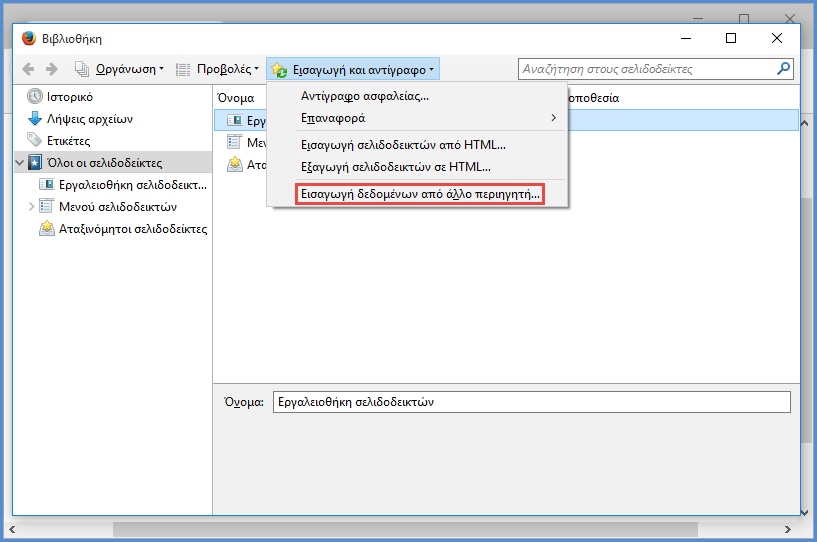 Το Mozilla Firefox μπορεί να δεχτεί σελιδοδείκτες που έχουμε αποθηκεύσει σε τρίτους browser που χρησιμοποιούμε. Για να γίνει αυτό, ανοίγουμε το Mozilla Firefox φροντίζοντας ο άλλος browser να είναι κλειστός. Πηγαίνουμε στην καρτέλα "Βιβλιοθήκη" και κάνουμε κλικ στο "Εισαγωγή και αντίγραφα ασφαλείας σελιδοδεικτών", όπως δείξαμε προηγουμένως.