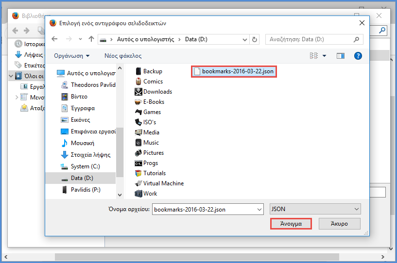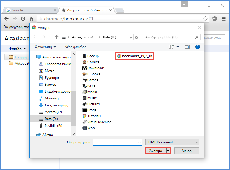 Στη συνέχεια, επιλέγουμε "Εισαγωγή σελιδοδεικτών σε μορφή HTML…". Στο παράθυρο που εμφανίζεται, επιλέγουμε το αντίγραφο ασφαλείας των σελιδοδεικτών που αποθηκεύσαμε στο προηγούμενο βήμα και πατάμε στο "Άνοιγμα".
