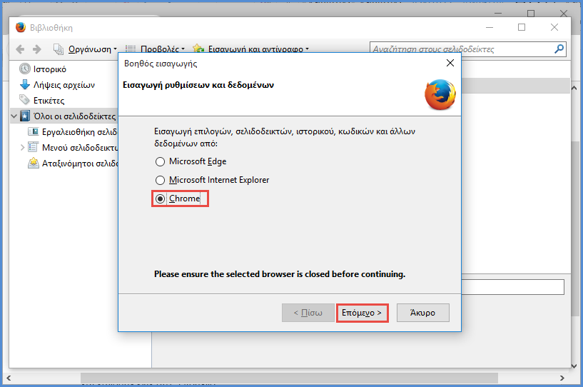 Στη συνέχεια, επιλέγουμε τον browser του οποίου τους σελιδοδείκτες θέλουμε να εισάγουμε και κάνουμε κλικ στο "Επόμενο".