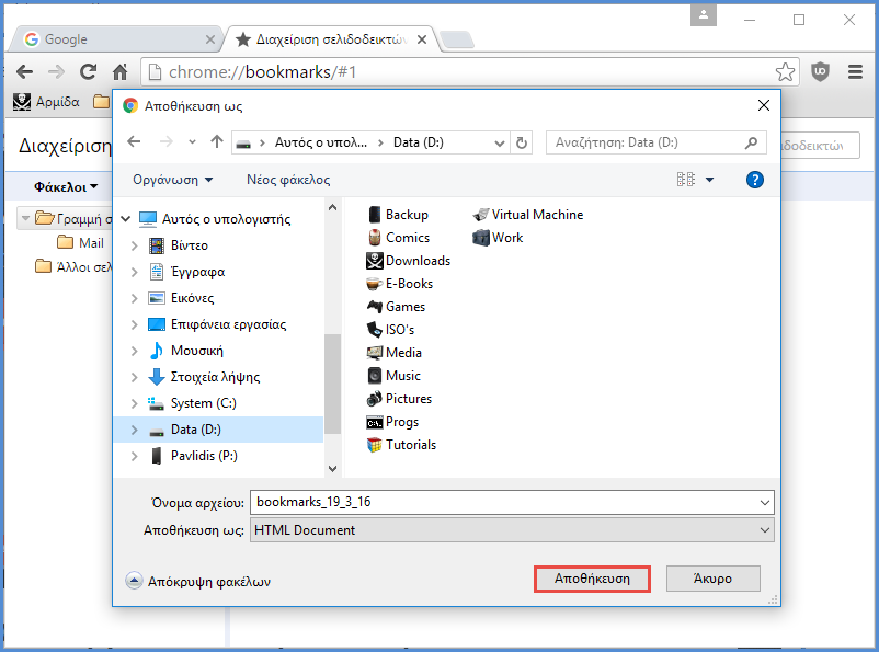 Ακολούθως, επιλέγουμε "Εξαγωγή σελιδοδεικτών σε μορφή HTML…". Στο παράθυρο που εμφανίζεται, επιλέγουμε που θέλουμε να αποθηκευτεί το αντίγραφο ασφαλείας των σελιδοδεικτών και πατάμε "Αποθήκευση".