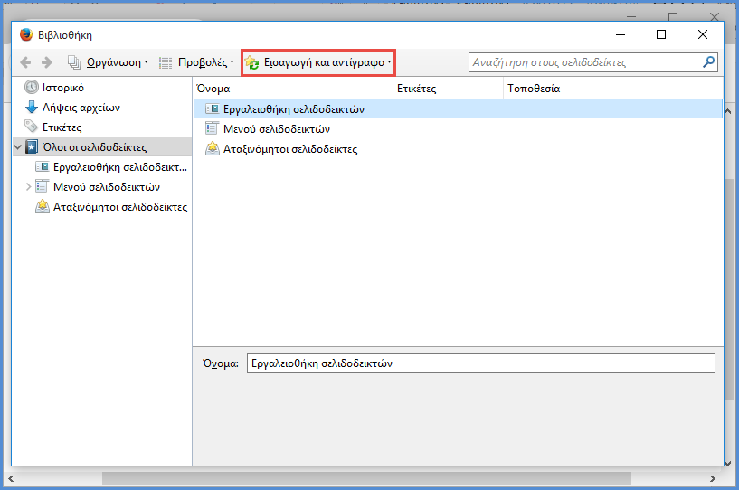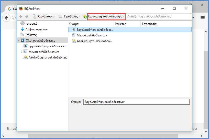 Παρατηρούμε ότι έχουμε μεταφερθεί στην καρτέλα "Βιβλιοθήκη". Εκεί πατάμε στην "Εισαγωγή και αντίγραφα ασφαλείας σελιδοδεικτών".