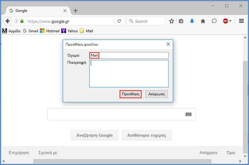 Το Mozilla Firefox μας παρέχει τη δυνατότητα να δημιουργήσουμε φακέλους για καλύτερη κατηγοριοποίηση των σελιδοδεικτών. Για να γίνει αυτό, κάνουμε δεξί κλικ πάνω στη γραμμή σελιδοδεικτών και επιλέγουμε "Νέος φάκελος". Στο παράθυρο που εμφανίζεται δίνουμε το όνομα που θέλουμε στο φάκελο και πατάμε "Προσθήκη".
