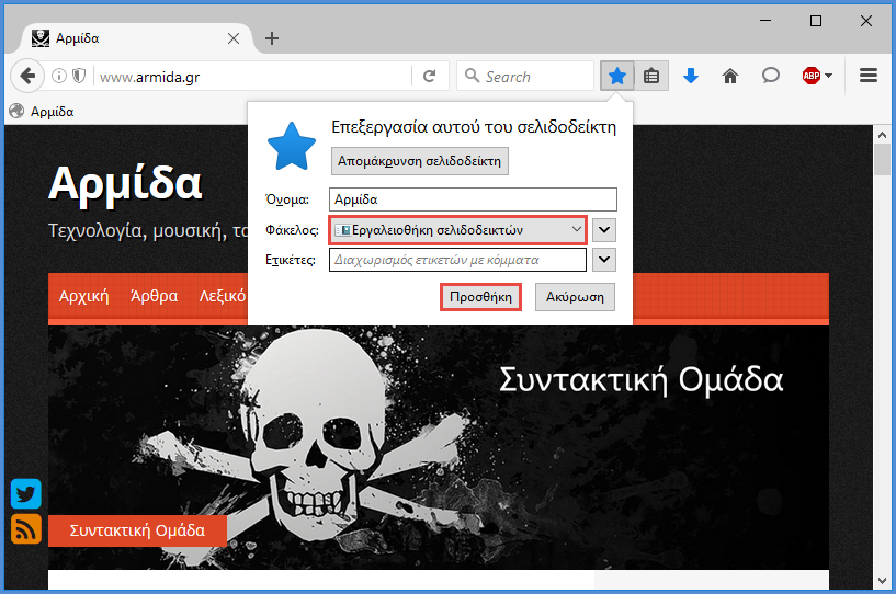 Η σελίδα μας έχει αποθηκευτεί ως σελιδοδείκτης αλλά δεν εμφανίζεται στη γραμμή σελιδοδεικτών. Για να γίνει αυτό, ξανακάνουμε κλικ στο αστεράκι. Στο μενού που εμφανίζεται επιλέγουμε στο πεδίο "Φάκελος" το "Εργαλειοθήκη σελιδοδεικτών" και στη συνέχεια πατάμε στην "Προσθήκη".