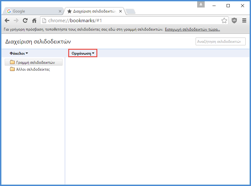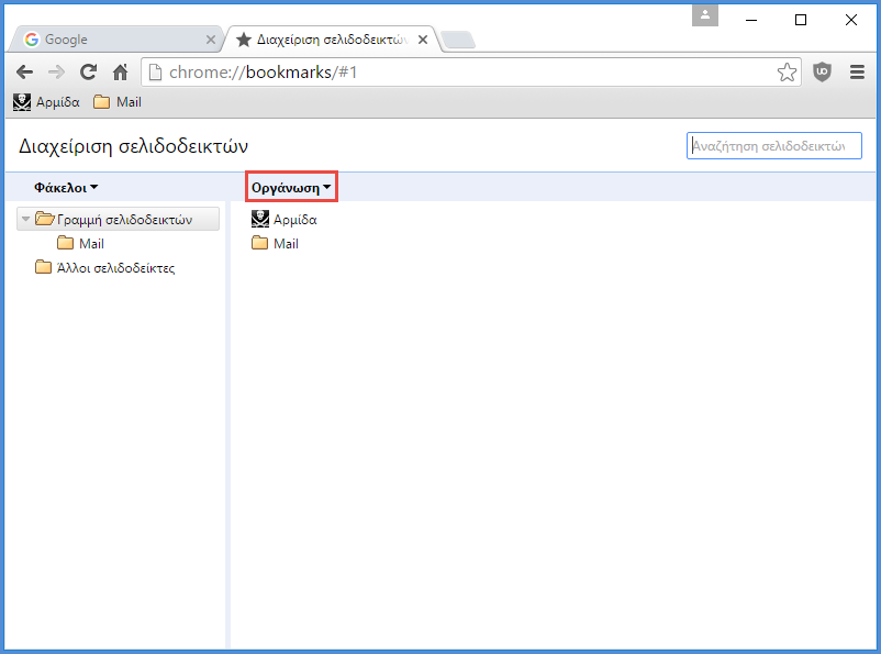 Για να επαναφέρουμε τους σελιδοδείκτες μας ή να τους μεταφέρουμε σε κάποιον τρίτο υπολογιστή, πρώτα ανοίγουμε το Google Chrome. Πατάμε ταυτόχρονα "Ctrl + Shift + O". Παρατηρούμε ότι έχουμε μεταφερθεί στην καρτέλα "Διαχείριση σελιδοδεικτών". Εκεί κάνουμε κλικ στο "Οργάνωση".