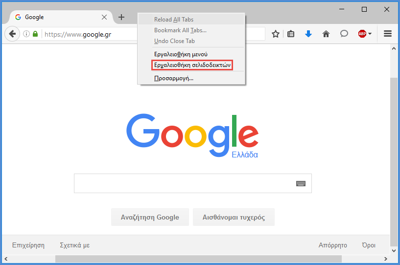 Αρχικά, ανοίγουμε το Mozilla Firefox. Αν η γραμμή σελιδοδεικτών δεν εμφανίζεται, κάνουμε δεξί κλικ στο χώρο δίπλα ακριβώς από το "+" που ανοίγει μια καινούρια καρτέλα. Στις επιλογές που εμφανίζονται, επιλέγουμε την "Εργαλειοθήκη σελιδοδεικτών".