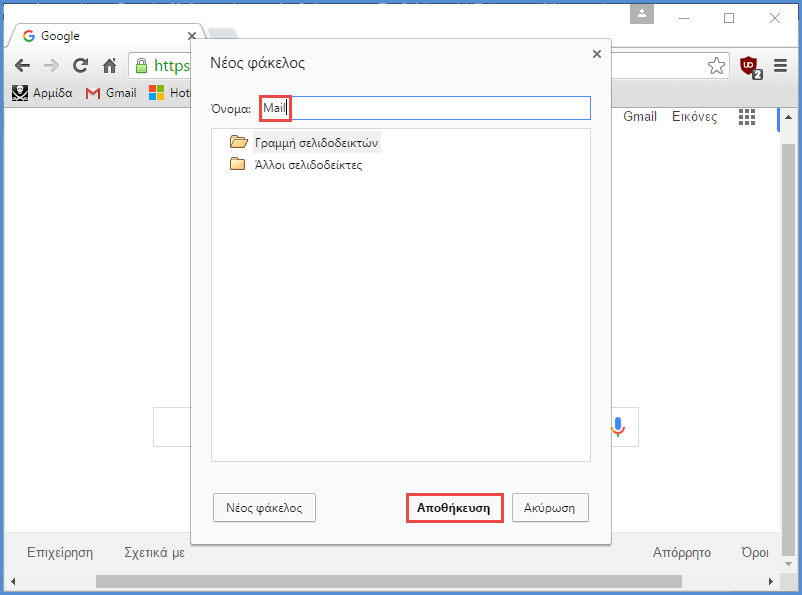 Το Google Chrome μας παρέχει τη δυνατότητα να δημιουργήσουμε φακέλους για καλύτερη κατηγοριοποίηση των σελιδοδεικτών. Για να γίνει αυτό κάνουμε δεξί κλικ πάνω στη γραμμή σελιδοδεικτών και επιλέγουμε "Προσθήκη φακέλου…". Στο παράθυρο που εμφανίζεται, δίνουμε το όνομα που θέλουμε στο φάκελο και πατάμε "Αποθήκευση".